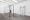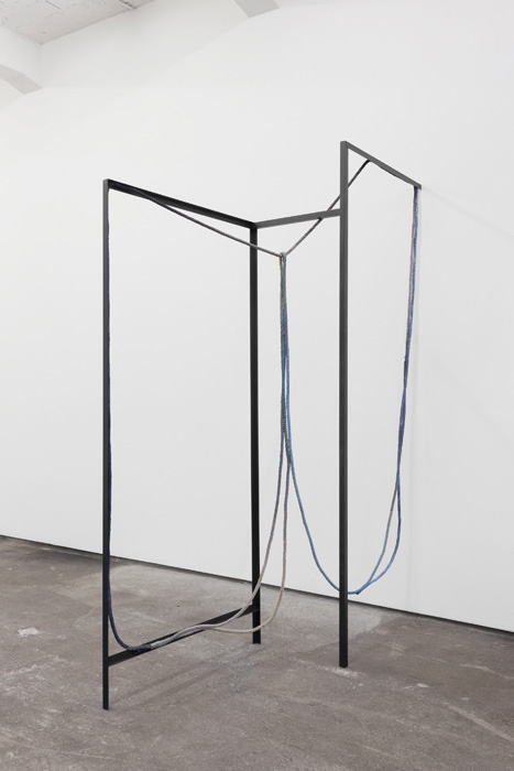 Keating is fascinated by materiality and the relationships that this can give rise to. Earlier works draped cut-up carpet around steel armatures. In Passage, the sculptures are stripped to the most minimal of forms — rope suspended from steel frames — yet in spite of their slender physicality they convey a bodily presence, rendering the contrasts between hard and soft, upright and falling as inherently disquieting. Organic meets with geometric in these works, Apollonian with Dionysian. The lengths of rope have partly been painted and subtly change hue along their lengths. Seen through the steel rectangles, their fluid lines are painterly compositions in space and reference the histories of both painting and sculpture; their use of gravity as a compositional device recalling colour field painting, drip technique or the fragile, process-based sculptures of Eva Hesse.