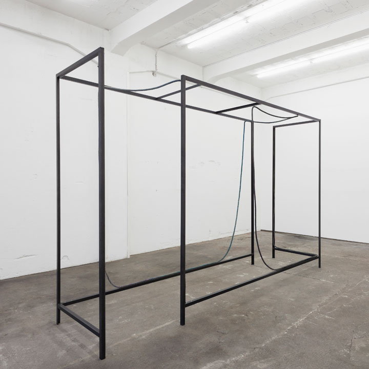 Keating’s skein of ropes hint at chaos, whilst their right-angled metal frames assert order. Yet logic is adjusted in these sculptures, which reconfigure recognisable objects to create abstract scenarios and which are simultaneously sculpture and painting. Whilst the steel frames initially resemble vitrines — indeed the sculpture occupying the front gallery is reconfigured from one — they lack their referents’ impartiality and reason. Instead their forms are enigmatic and duplicitous, suggesting an invisible architecture of doorways and pathways that fail to properly function. Passages become too narrow to pass through, their structural propositions being both impeded and finished by the rope, and there seems to be a transferral of properties between these two quite different materials. Keating is interested in how little is needed in a work — how much can be apprehended in the mind, and how an artwork might transcend its physical limits. His sculptures question the distinction between surface and reality, finding presence as much in the space in between materials as within the objects themselves, and depicting the nature of the world as infinitely particular.