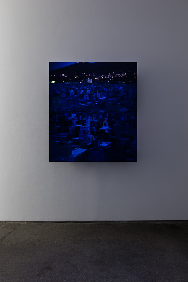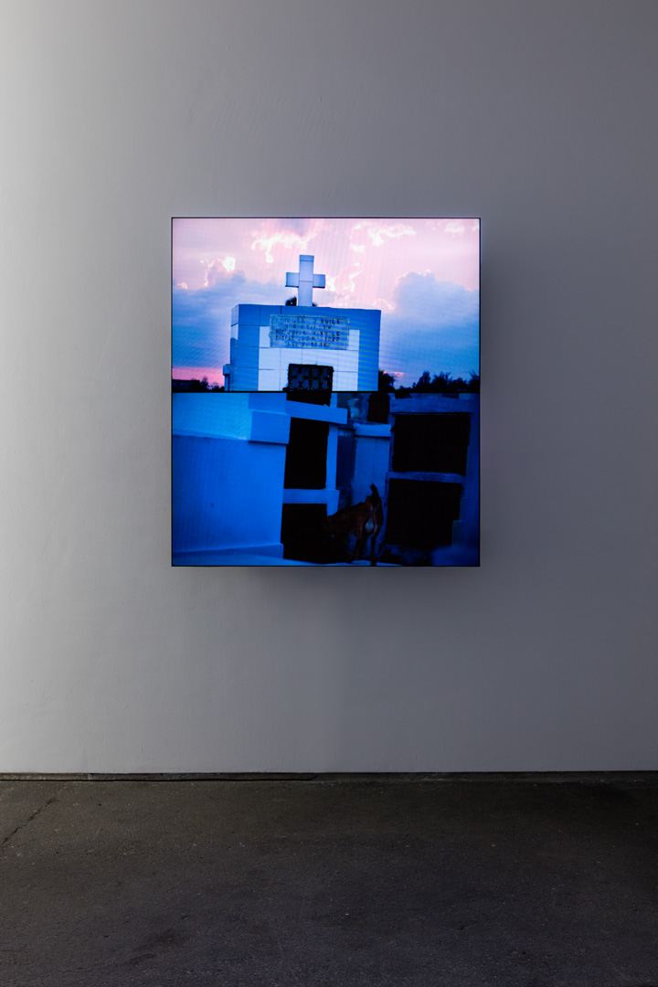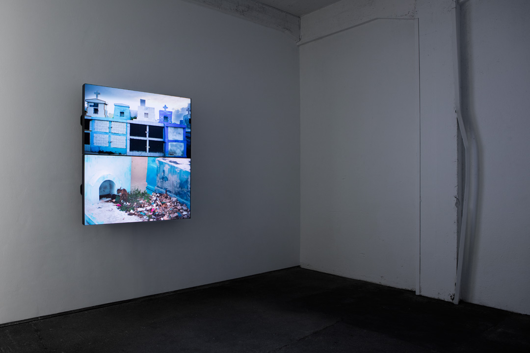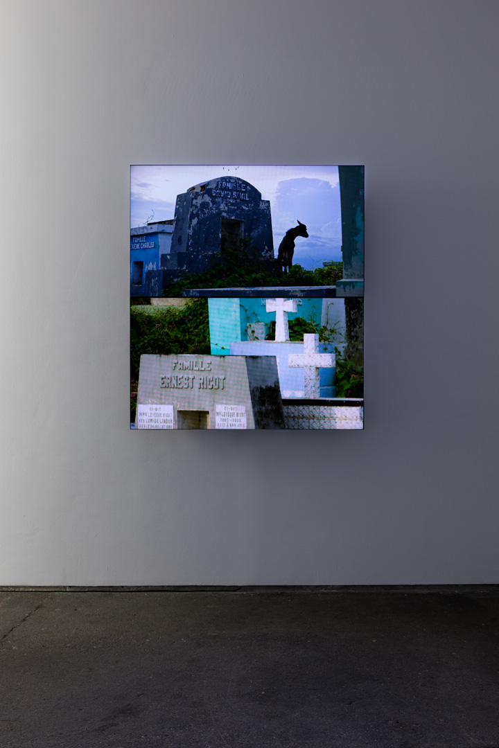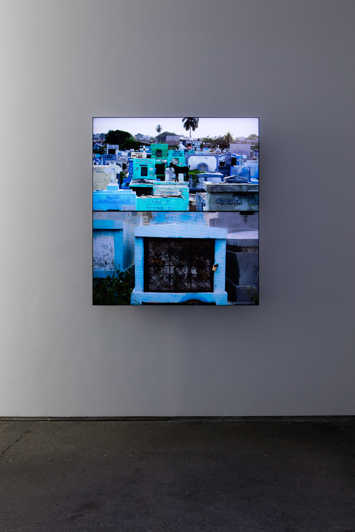 In Baron Samedi, shown for the first time at last year’s Triennale in Milan, a silent nine-minute film reveals something strange on two monitors in an installation. At dawn, architectural shapes arise that turn out to be tombs. As the day progresses, they are staged in carefully composed shots. The presentation on the frameless monitors enables an interplay of geometry, alignment and perspectives. Wild goats move freely among and atop the tombs.