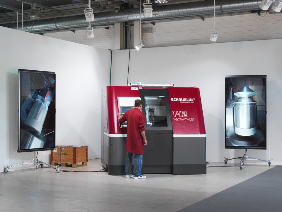 Built in a quiet village in the Swiss Jura, the machine is used to produce extremely fine metal machine parts by an international clientele for everything from fine art sculpture to advanced weapons systems components and aerospace. Hefti brings this hulking and incredibly precise machine into the context of the art fair, a place where production is normally absent, and programs it to perform its work of milling solid aluminum. This machine-based performance will consist of the reduction of blocks of the solid aluminum to nothing. The work poses questions about the relationship between art production, high-tech industry, and the terms of materials and spectatorship for each.