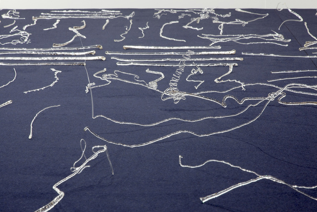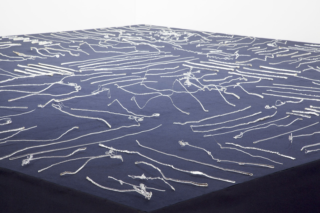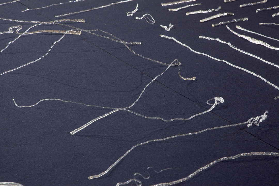 Alongside Meteorological Phenomena, a paper plume with the aroma of ozone is held between two silver stripes on the wall. The odor comes from the joint of the three synthetically produced oxygen molecules used in the perfume industry. The scent is strong and has a particular and recognizable scent. Naturally, when the weather produces ozone, it creates it in various ways, one of which is when there is atmospherical electrical discharge. This kind of discharge can be found during a lightning storm. The distinctive smell of a lightning storm is the smell of ozone. As the glass fulgurites, the paper plume holds a scent produced by meteorological phenomena that one might slip to see unless framed under a material representation.