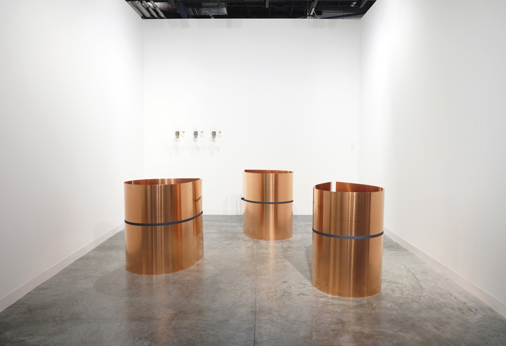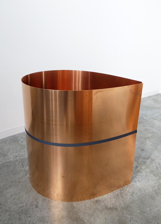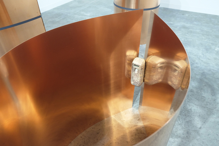 Each of these works will sit directly on the floor — each brass sheet ‘cylinder’, measuring approximately 1400mm height x 700mm dia, will be held in shape by the scent emission device, which is timed to release its non-scent every few minutes.