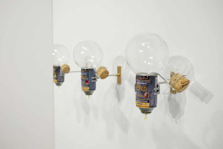 The sheet metal cylinders are brass (an alloy); brass is employed in much of Dane Mitchell’s sculptural practice — for him it operates as a representation (and presentation) of traditional sculptural material in raw-form, (un-changed from an industrial supplier). Being an alloy, it is formed under duress — through the collision and transformation of elemental metals (copper and zinc) at extreme temperatures. These raw materials are then strapped together using the scent-delivery device in a primary and fundamental way to suggest something akin to a conventional sculptural form.