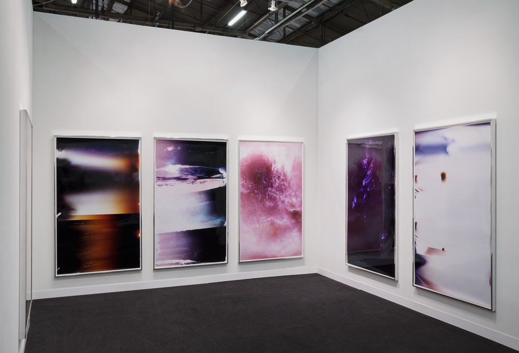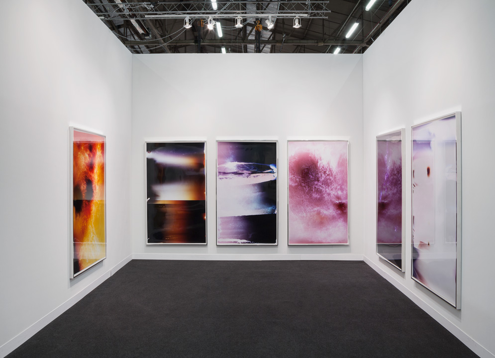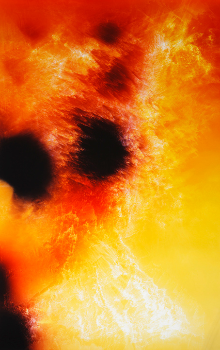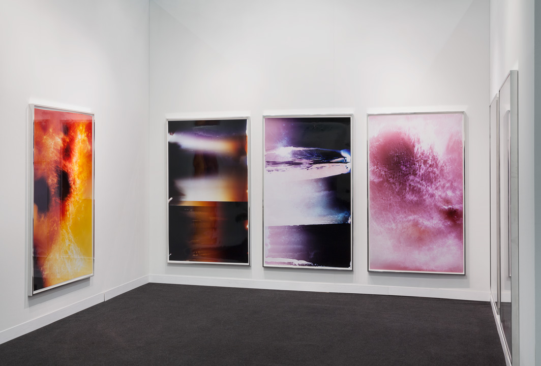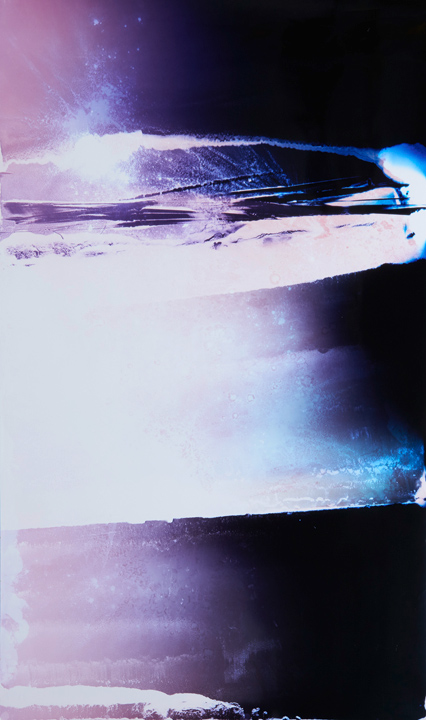 "...Bursts of pink, purple, pale violet, the photogram’s ‘image’ a kind of abstraction that we often describe as celestial – comets burning out, say, or black holes framed by stars. (Note here we reach for a metaphor to describe the very event being ‘photographed’: spores burned into another material, photo paper, as an image.) For this Lycopodium (2014) series, the photograms were made in pitch dark as Hefti lit the flammable moss spores of the titular powder – regularly used in fireworks and explosives, as well as for the coating of pharmaceuticals – over entire rolls of colour photosensitive paper. Lycopodium in particular strikes a nearly perfect history for Hefti to draw from: in the early 19th century, Joseph Nicéphore Niépce used the powder to fuel the first internal combustion engine; later he invented photography (View from the Window at Le Gras, from 1826, is his). But Hefti’s Lycopodium images also suggest something else: a collusion of postwar gestural colour field painting and recent abstract photography, aesthetic registers well understood by a contemporary art audience. Part of the strangeness of the artist’s work lies in this: our familiarity with the (high art, creative) aesthetic forms he creates, and our unfamiliarity with the (quotidian, industrial) material processes he uses to achieve them."