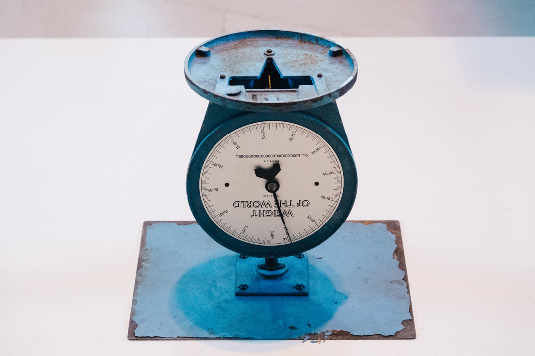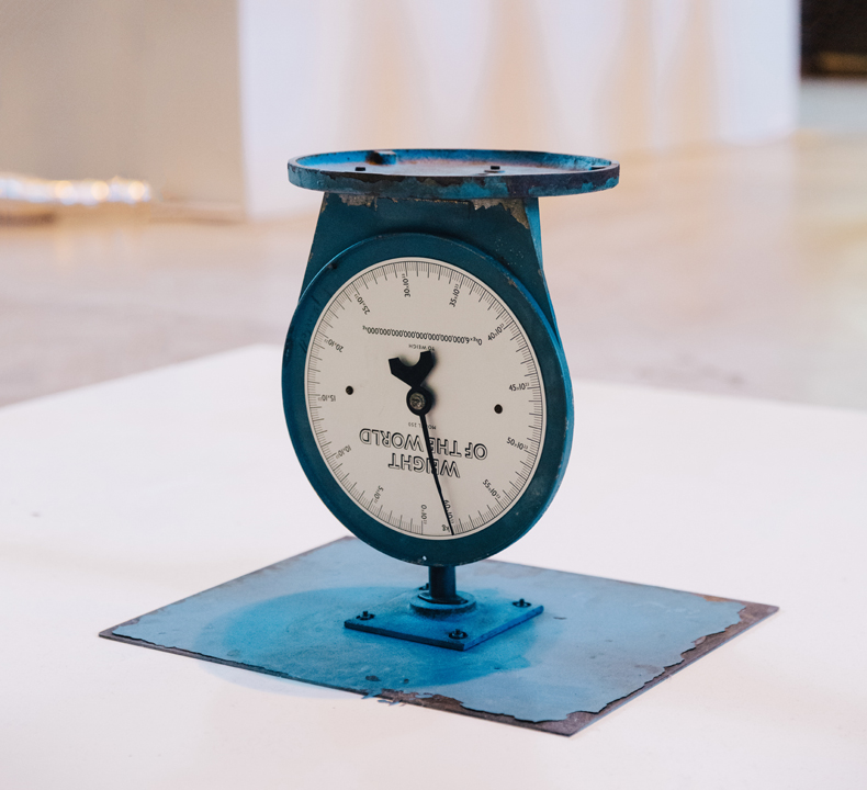 In his practice Mitchell kneads together two perspectives. The first 'what we feel we know' through empirical evidence (including the sphere of particles, forces, thermodynamics, mass, weight). The second is an activation of 'what we can't know' through employing that which is philosophically and epistemologically problematic (including witchcraft, perfumery, hypnotherapy and conceptual leaps). In the merging of 'what we feel we know' and 'what we can't know', a space is opened up within and between these perspectives, exemplified by Weight of the World, 2014 — a work that turns the planetary mass into an object, stating its weight as a form. Weight of the World (an upturned set of scales) reveals the planet to be an entity in orbit that exists as a closed system, with immunity to states of material change to its overall weight, following the law of conservation of mass — something we feel we know, yet in practice, can’t.